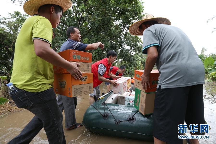9月18日,在廣東省陽江市陽春市,人們把食物搬運到筏子上,準備分發給受困村民。 新華社記者張加揚攝
