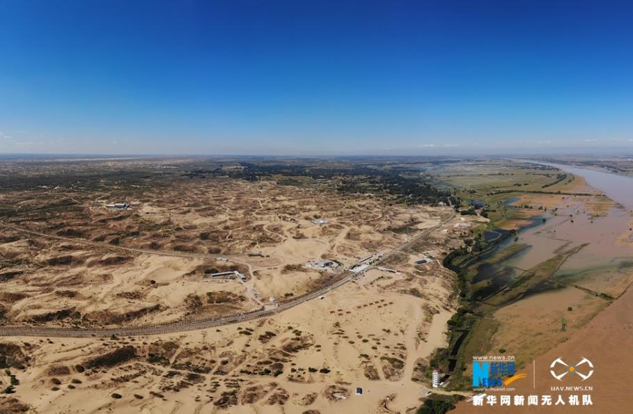 航拍黃河托克托段兩岸風光,西案的灘涂與沙漠相連。新華網 張偉 攝