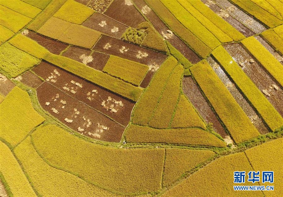 這是廣南縣八寶鎮壩龍村的稻田景色(9月20日無人機拍攝)。 云南省文山壯族苗族自治州廣南縣八寶鎮今年種植優質水稻22000余畝,秋收季節,田野里一片金黃,景色如畫。 新華社記者楊宗友攝