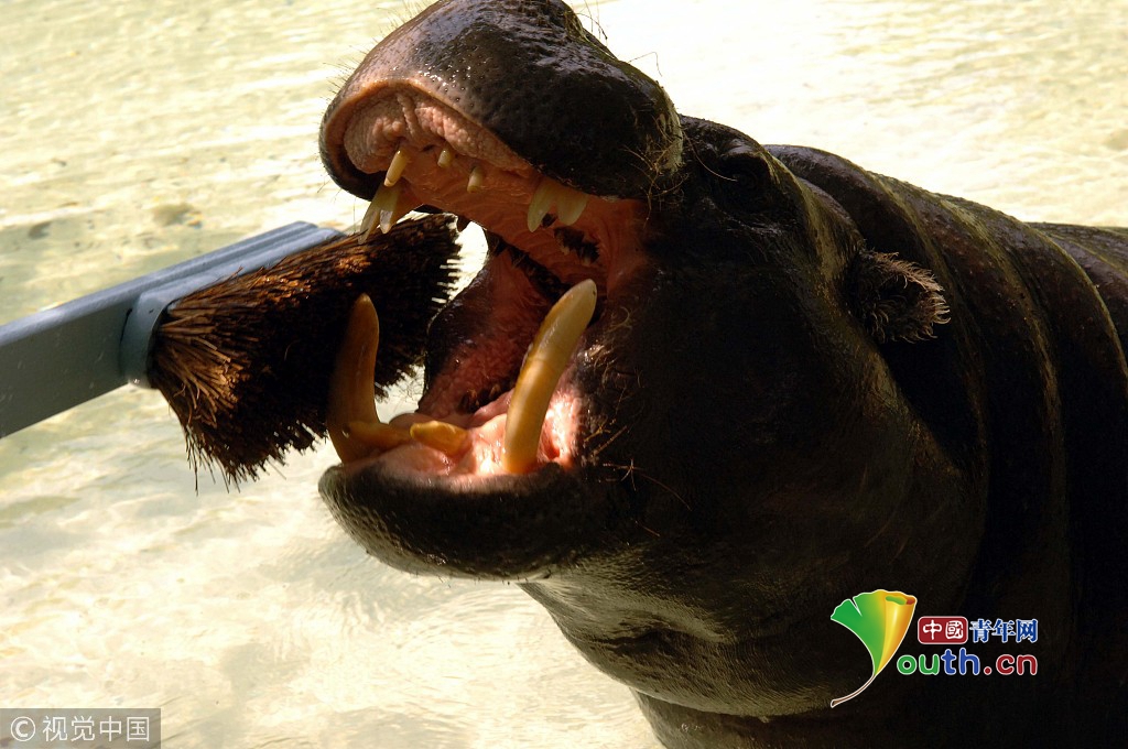 2006年7月20日,英國倫敦動物園里,工作人員正在用一個新的5英尺長的牙刷給河馬Thug刷牙。動物園里的兩只河馬Nicky與Thug,它們分別有一個粉色和藍色的牙刷。為了慶祝換新牙刷,倫敦動物園將在23日“不要忘記牙刷日”實行入園半價優惠。