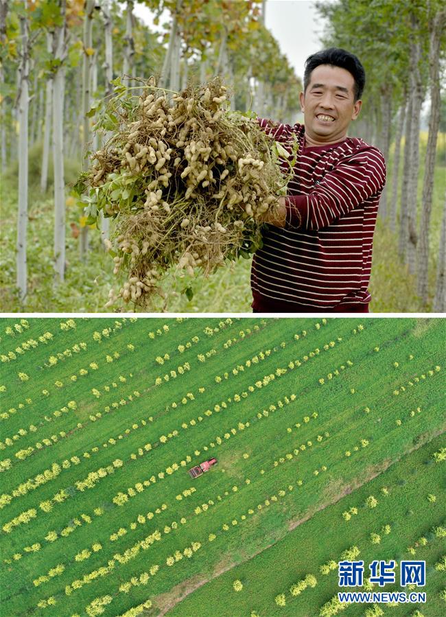這張拼版照片顯示的是:上圖,9月18日,河北邢臺經濟開發區郭龍莊村農民王路坤展示收獲的花生;下圖,9月18日,王路坤駕駛農機收獲花生(無人機拍攝)。 新華社記者牟宇攝