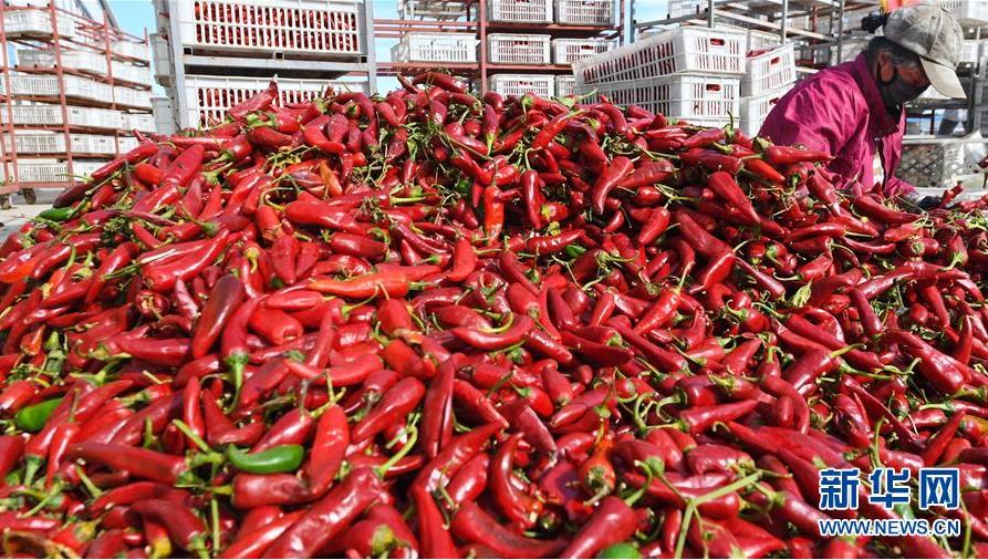 9月19日,在吉林省白城市通榆縣,農(nóng)民在分揀收獲的辣椒。 新華社記者 張楠 攝