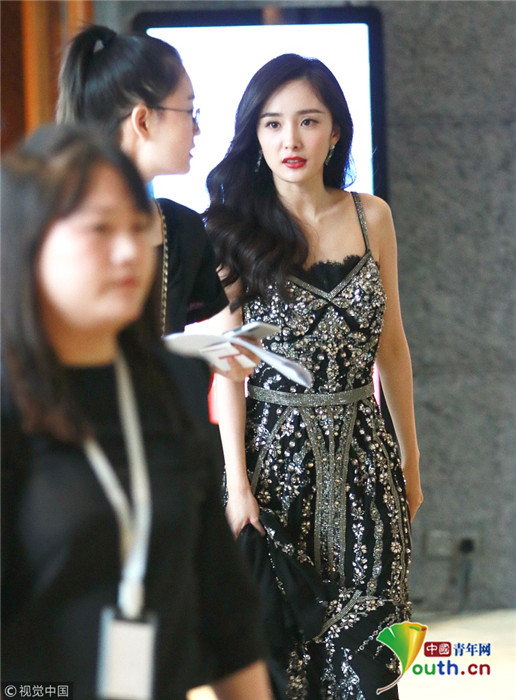 楊冪卷發成熟美露香肩 自提裙擺過酒店大堂