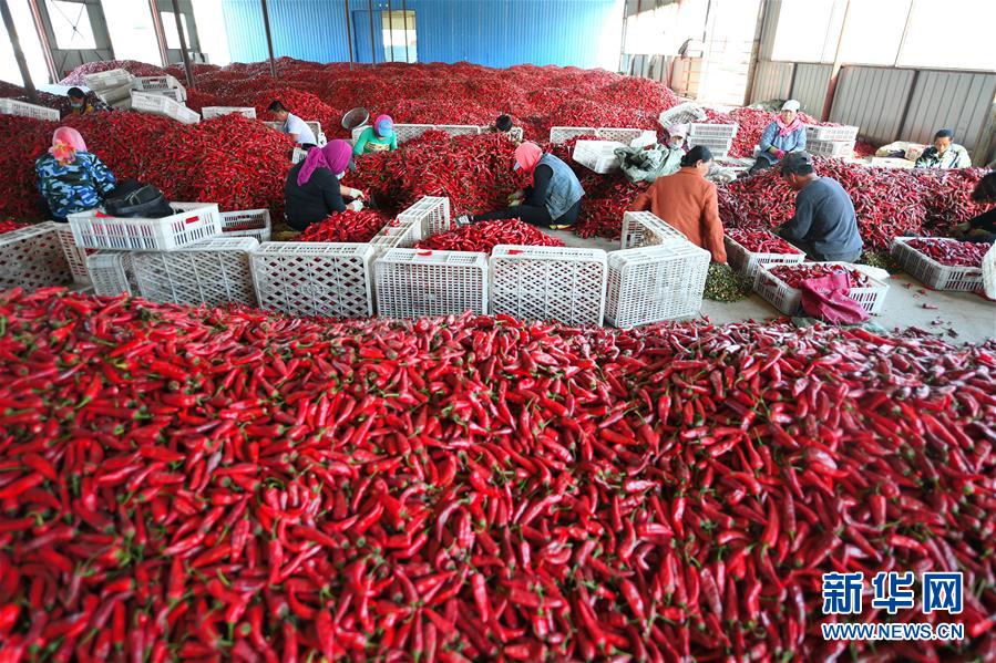 9月16日,阜城縣王集鄉(xiāng)南張莊村農(nóng)民在整理收獲的辣椒。近年來,河北省阜城縣王集鄉(xiāng)在推進(jìn)產(chǎn)業(yè)富民過程中,積極引導(dǎo)農(nóng)民調(diào)整農(nóng)業(yè)產(chǎn)業(yè)結(jié)構(gòu),按照品種特色化、種植規(guī)模化、產(chǎn)銷一體化的“公司+基地+農(nóng)戶”的經(jīng)營模式,鼓勵(lì)農(nóng)民發(fā)展特色辣椒種植,推行“訂單種植”模式,開辟出了一條農(nóng)民創(chuàng)收新路徑。目前,阜城縣王集鄉(xiāng)辣椒種植面積3100余畝,每畝年收益2500元以上,帶動當(dāng)?shù)剞r(nóng)民實(shí)現(xiàn)增收。新華社記者朱旭東攝