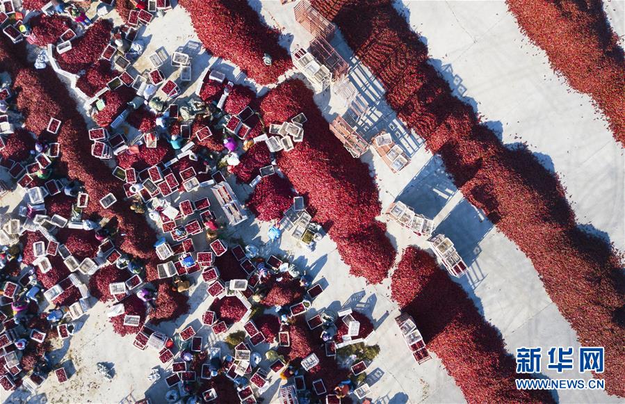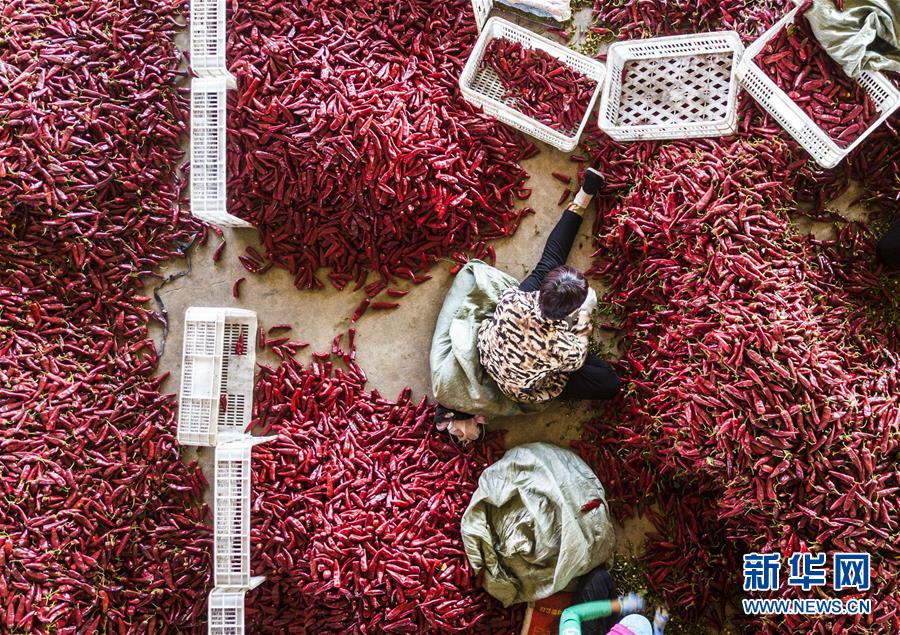 9月16日,阜城縣王集鄉(xiāng)南張莊村農(nóng)民在采摘辣椒(無人機(jī)拍攝)。近年來,河北省阜城縣王集鄉(xiāng)在推進(jìn)產(chǎn)業(yè)富民過程中,積極引導(dǎo)農(nóng)民調(diào)整農(nóng)業(yè)產(chǎn)業(yè)結(jié)構(gòu),按照品種特色化、種植規(guī)模化、產(chǎn)銷一體化的“公司+基地+農(nóng)戶”的經(jīng)營模式,鼓勵(lì)農(nóng)民發(fā)展特色辣椒種植,推行“訂單種植”模式,開辟出了一條農(nóng)民創(chuàng)收新路徑。目前,阜城縣王集鄉(xiāng)辣椒種植面積3100余畝,每畝年收益2500元以上,帶動當(dāng)?shù)剞r(nóng)民實(shí)現(xiàn)增收。新華社記者朱旭東攝