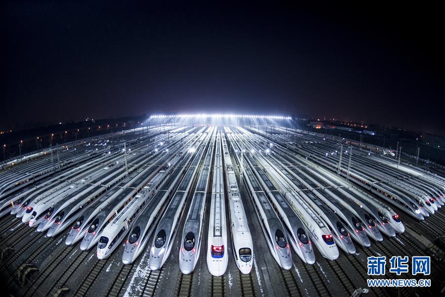2018年2月1日凌晨,動車組??吭谖錆h動車段的存車線上,準(zhǔn)備進(jìn)行檢修和保溫作業(yè)。近百組在武漢動車段經(jīng)過檢修、保溫作業(yè)的動車組蓄勢待發(fā),迎接春運。新華社記者 肖藝九 攝