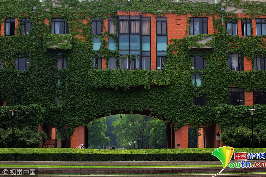 2018年5月10日,北京。在清華校園內教學樓、辦公樓等多處建筑物上被爬山虎攀爬扮綠,呈現一派綠裝素裹自然美麗景觀。