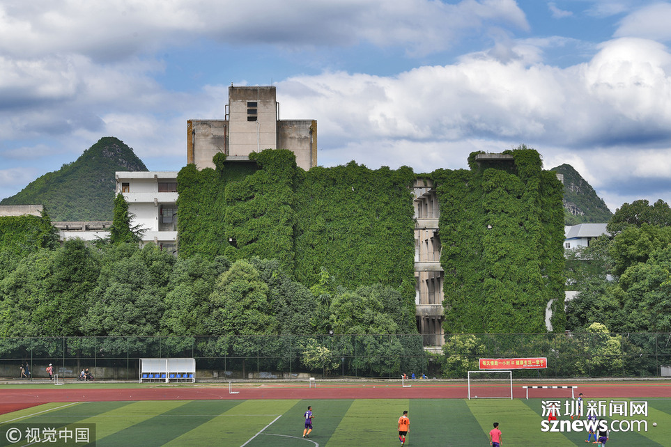 2018年6月20日,貴陽,貴州大學現12層樓近50米高綠色“巨瀑”。據悉,這是該校的老師們在26年前栽種的300多棵爬山虎,如今爬滿12層高的圖書館大樓,猶如“綠色城堡”。