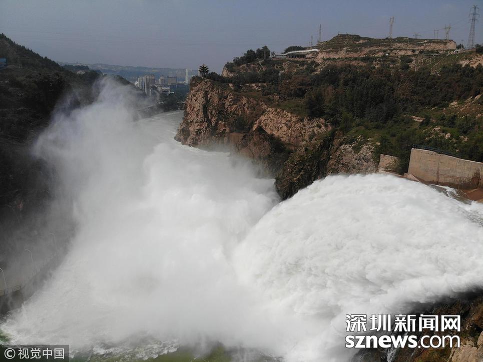 2018年9月11日,甘肅臨夏,劉家峽水庫泄洪力降水位。今年主汛期以來,受黃河上游持續大范圍降雨影響,劉家峽水庫入庫流量大幅增長,為確保黃河中下游安全度汛,劉家峽水電廠按照黃河防總調度要求,不斷調控下泄流量,全力做好防汛度汛工作。