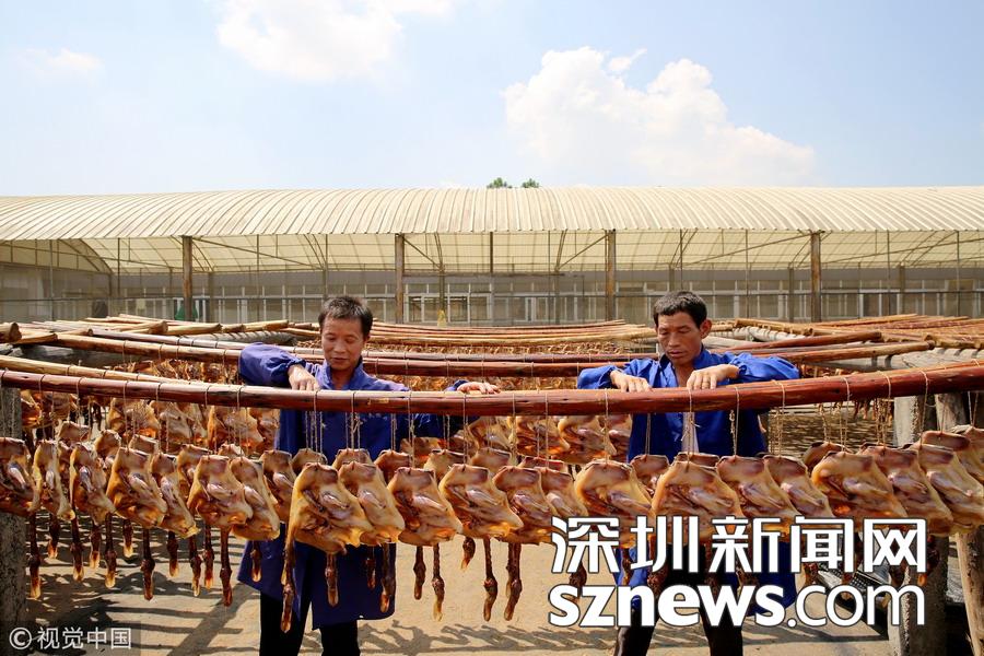 2018年9月19日,江西吉安,吉水縣八都鎮板鴨廠的員工正在晾曬板鴨。