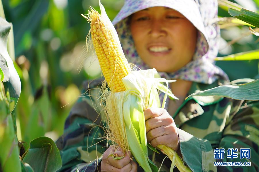 9月23日,河北省灤縣茨榆坨鎮西長坨村農民賈麗萍在展示收獲的玉米。