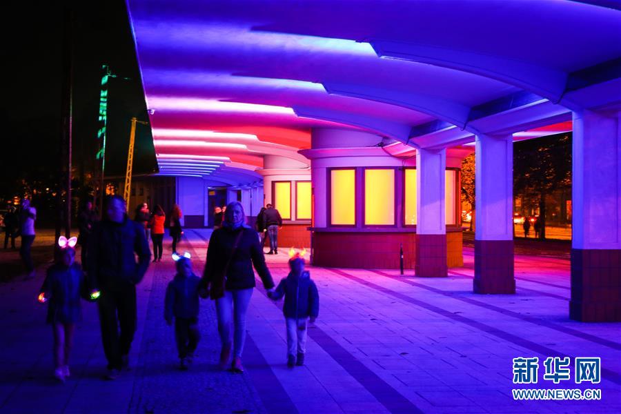 9月28日,游客在波蘭羅茲市中心舉辦的2018“舞動”燈光節上游玩。2018“舞動”燈光節于9月28日至30日在波蘭中部交通樞紐城市——羅茲市舉行,各式各樣的光影表演在這座城市的各個角落同時上演,組成了一場如夢如幻的大型燈光秀。新華社記者陳序攝