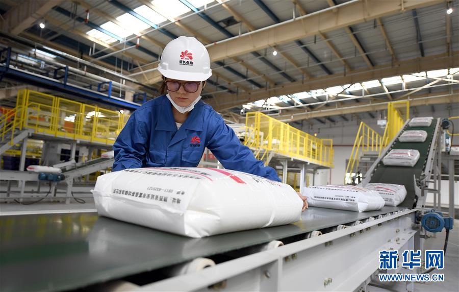 延安煤油氣資源綜合利用項目包裝車間的工作人員進行產品包裝檢查(9月28日攝)。新華社記者劉瀟攝