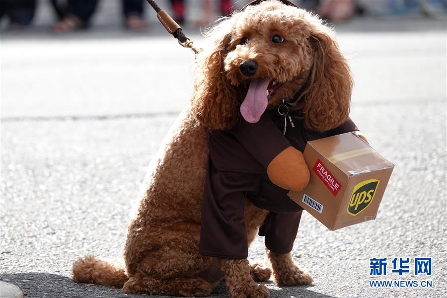 9月29日,在美國加利福尼亞州伯林蓋姆市,一只寵物狗參加大游行活動。美國加州舊金山灣區的伯林蓋姆市29日舉行寵物狗大游行活動。新華社記者吳曉凌攝
