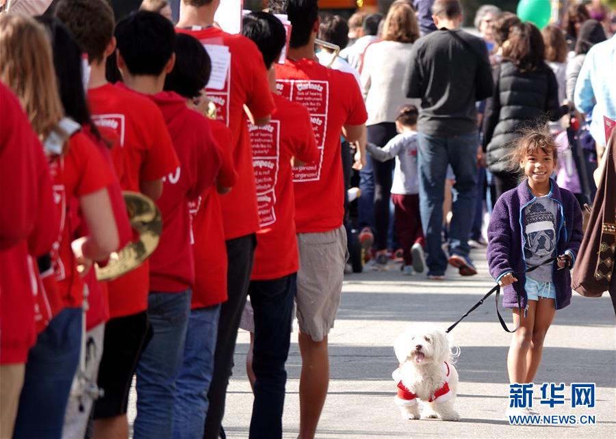 9月29日,在美國加利福尼亞州伯林蓋姆市,一支學生樂隊參加寵物狗大游行活動。美國加州舊金山灣區的伯林蓋姆市29日舉行寵物狗大游行活動。新華社記者吳曉凌攝