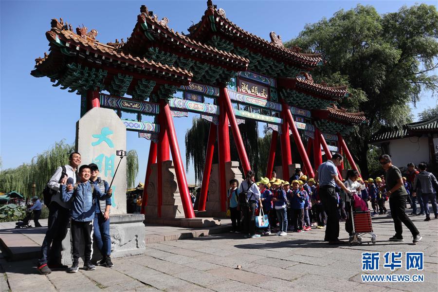 9月30日,游客在免費開放的濟南市大明湖景區游覽。近年來,山東積極推進國有景區免費開放工作,截至目前,山東實現免費開放的國有景區已達286處。新華社記者徐速繪攝