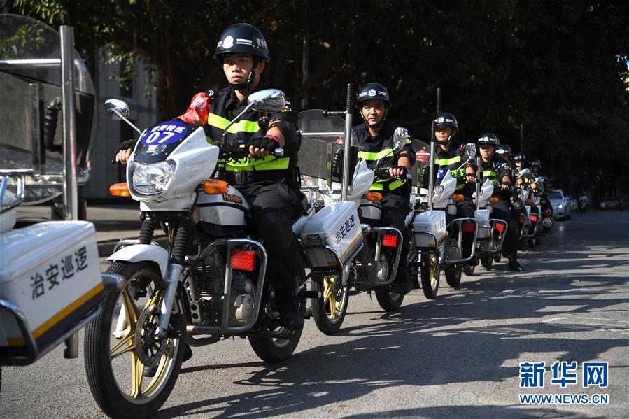 10月1日,廣西南寧市公安局南湖分局治安巡邏隊在南寧市東葛路上巡邏。當日是國慶節,許多勞動者堅守在工作一線,在崗位上度過節日。新華社記者周華攝