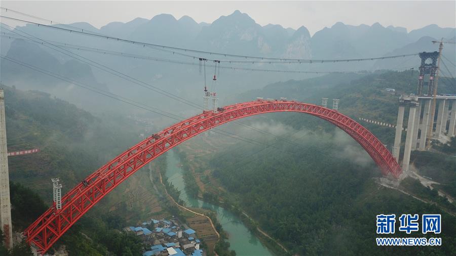 9月12日使用無人機拍攝的大小井特大橋。 目前,橫跨在貴州省羅甸縣大井河上的大小井特大橋建設進入沖刺階段。大小井特大橋全長1.5公里,主跨450米,是世界最大跨徑上承式鋼管混凝土拱橋。據了解,該橋是平塘至羅甸高速公路關鍵性工程,對打通貴州“斷頭路”,助推滇黔桂石漠化片區脫貧攻堅具有重要意義。 新華社記者劉續攝