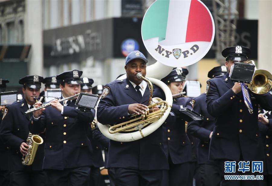 10月8日,在美國紐約曼哈頓第五大道,紐約警察樂隊參加哥倫布日游行。 新華社記者王迎攝