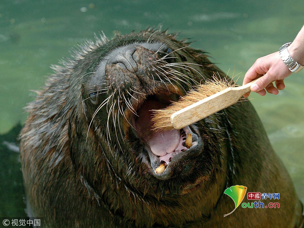 2006年5月18日,英國城市達(dá)德利,一只十四歲的海獅奧利爾在動(dòng)物園里接受飼養(yǎng)員的護(hù)理。奧利爾體重達(dá)四百千克,每次進(jìn)餐后飼養(yǎng)員要給奧利爾刷牙,每月進(jìn)行一次牙科衛(wèi)生檢查。
