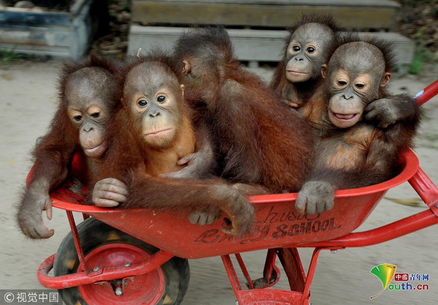 印尼動(dòng)物救援中心里 猩猩寶寶擠“校車”“上學(xué)”超萌