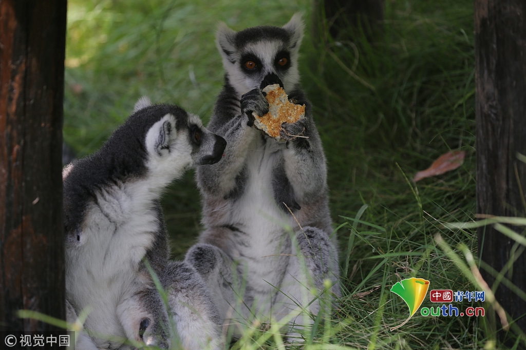 2017年10月4日,重慶永川樂和樂都的動(dòng)物飼養(yǎng)員給環(huán)尾狐猴喂食月餅。