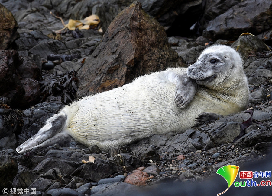 中國青年網(wǎng)北京10月9日電 當(dāng)?shù)貢r(shí)間2018年10月8日,英國彭布羅克郡,一只大西洋海豹幼崽躺在海邊礁石上。海豹幼崽出生時(shí)都有毛茸茸的白色非防水皮毛,它們會(huì)在第四周蛻皮。
