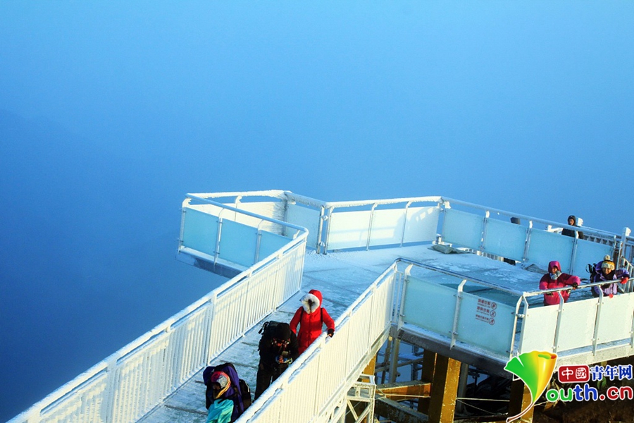 上到金子山最高峰可以看到,玻璃天梯像一條巨龍,沿著金子山最高峰山腰蜿蜒而上,每一個階梯都是玻璃做的,頂上是藍天白云,四周是莽莽群山,天梯下面是深不可測的懸崖絕壁?!?/p>
