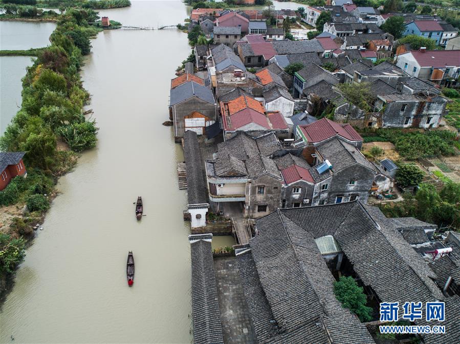 10月10日,泉家潭村村民劃著小船經過沿河長廊(無人機拍攝)。經過改造提升后,沿河長廊和整潔的古村街巷成為當地美麗鄉村的景觀帶。 新華社記者 徐昱