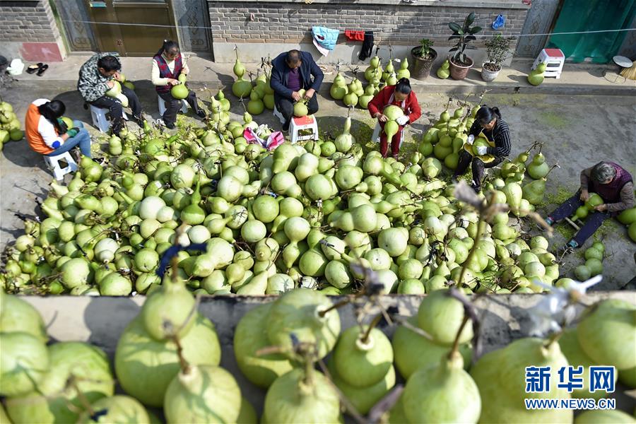 9月27日,山西省安澤縣和川鎮孔旺村的村民在摘葫蘆。近日,山西省安澤縣和川鎮孔旺村種植的葫蘆喜獲豐收,村民們忙著將摘下的葫蘆去皮晾干。孔旺村于2016年成立葫蘆種植合作社,種植、采摘、加工等環節全部由貧困戶負責,為貧困戶拓寬增收渠道。新華社記者 曹陽 攝