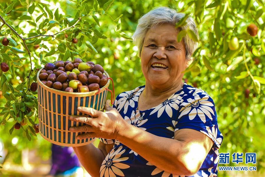 9月22日,河北省棗強縣棗強鎮孟家莊村的棗農在展示剛剛收獲的紅棗。 近日,河北省棗強縣的2000多畝棗園迎來收獲季,棗農們搶抓農時,采摘、篩選、晾曬紅棗,樂享秋收的快樂。 新華社記者李曉果攝