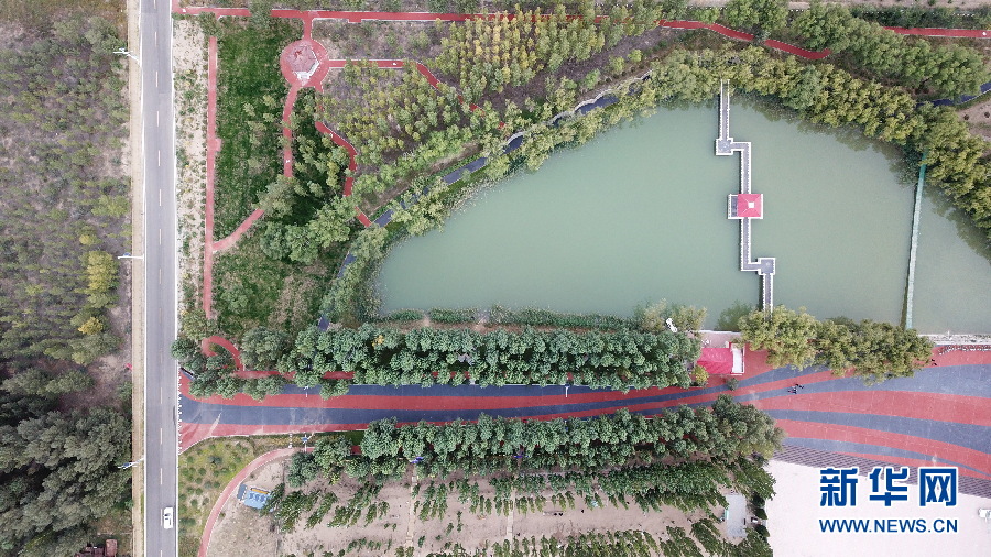俯瞰恩格貝月亮湖。(新華網 王宇 攝)