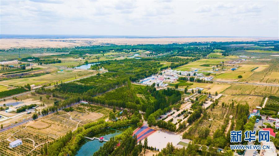 地處庫布其沙漠的恩格貝景區(6月8日無人機拍攝)。