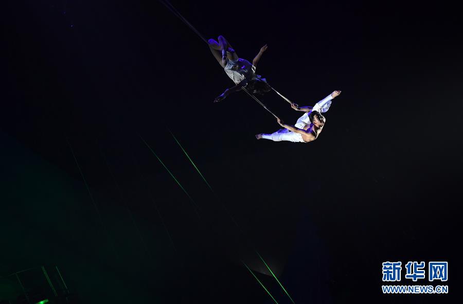 10月16日,演員在濮陽國際雜技藝術節上表演雜技《男女雙人秋千》。 新華社記者 朱祥 攝