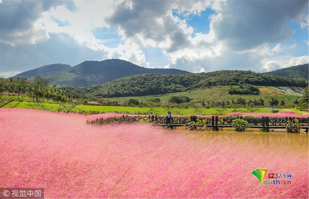 中國青年網(wǎng)北京10月7日電 2018年10月6日,游客在“粉色田野”里游玩、留影。粉黛亂子草是一種觀賞草種,該植物夏季為主要生長季,全株綠色,花期為9月中旬至11月中旬,開花時,綠葉為底,粉紫色花穗如發(fā)絲從基部長出,遠看如紅色云霧。