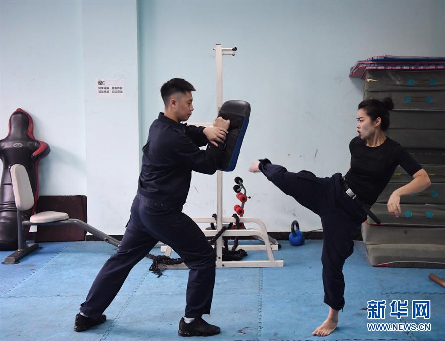 10月16日,湯春燕在健身房內進行擒敵訓練。