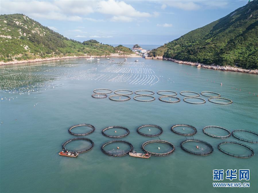 8月18日,漁船在南麂島馬祖岙海域的“海上牧場”大黃魚養殖區內喂食(無人機拍攝)。南麂島位于浙江東南海域,水質好,水溫、鹽度都適合大黃魚等養殖魚類的生長繁殖,因此當地的水產品也一直保持了較高的品質和口碑。進入8月,浙江省溫州市平陽縣南麂鎮海域上大片的大黃魚、貽貝等特色海產品養殖區域迎來豐收季節,養殖戶們駕駛漁船在養殖區海域進行打撈收獲,在碧海藍天下構成了一幅“海上牧場”的美麗豐收景象。近年來,南麂鎮政府引導漁民養殖戶充分發揮“靠海吃海”的資源優勢,大力發展海洋養殖經濟和海島旅游經濟,實現了南麂由“生態美”向“產業美”,“產業美”向“經濟美”的轉變。同時該鎮堅持以大黃魚、貽貝等為特色產業支撐,精準發展高效海洋養殖業,重點培養一批新型職業漁民,依靠專業技術支持,實現深海仿生養殖,讓好生態造就好品質,重點打造南麂養殖品牌,組建營銷網絡,拓展特色海產品市場。新華社記者 徐昱攝