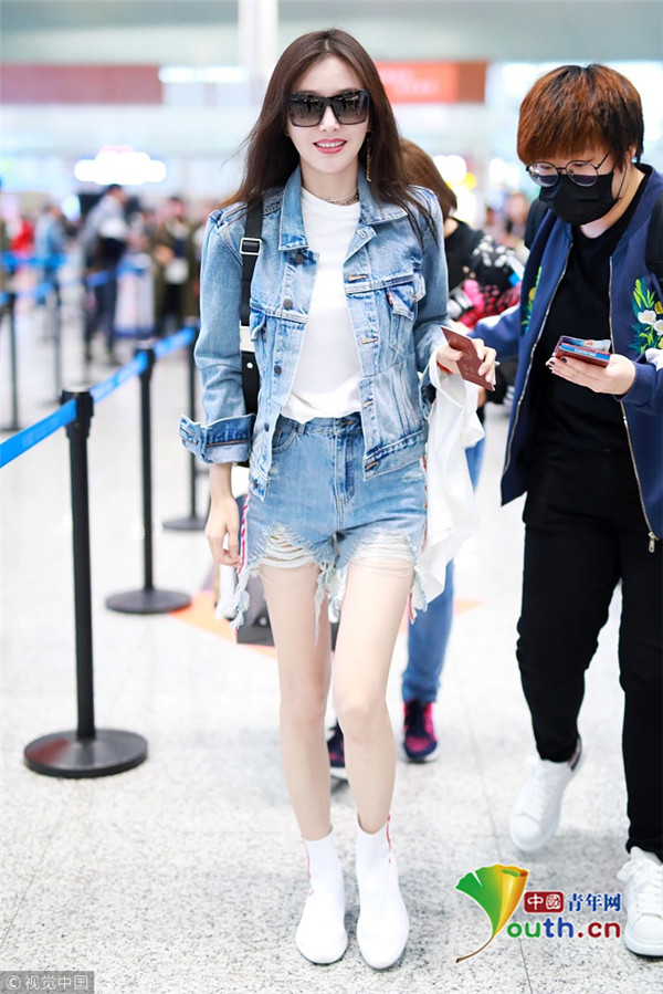 2018年10月17日,上海,秦嵐現身機場。她一身牛仔LOOK露出白皙長腿,雪膚紅唇美得不可方物,長發飄飄玉手撩發女神范十足。
