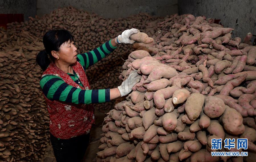 10月17日,陜西延安甘谷驛鎮史家溝村村民在整理剛收獲的紅薯。 金秋時節,農民們忙著收獲成熟的農作物,喜迎豐收。 新華社記者 劉瀟 攝