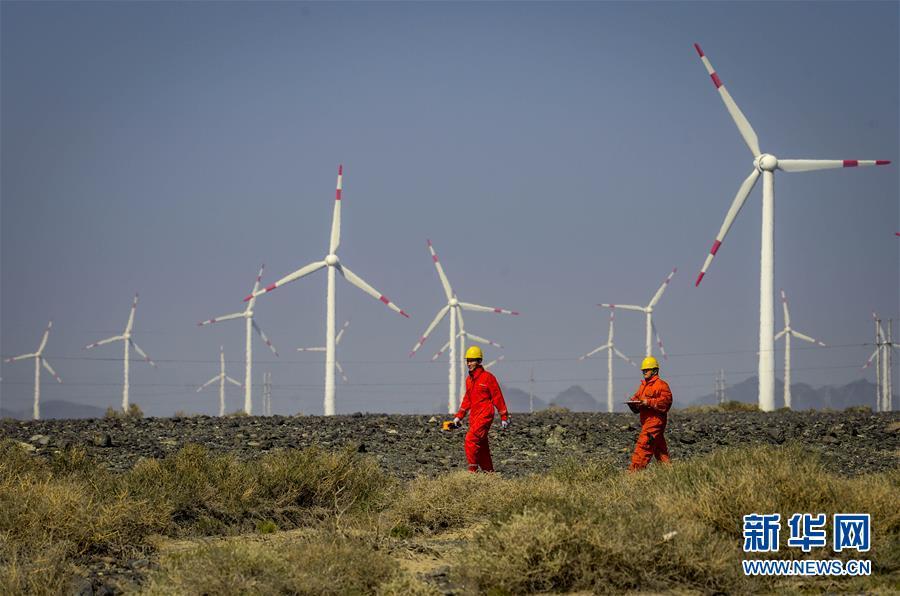 在新疆烏魯木齊達坂城風力發電場,工作人員馬木爾別克(左)和尤志強查看風力發電設備(2018年9月18日攝)。今年以來,新疆穩步推進新能源參與“疆電外送”、擴大與燃煤自備電廠調峰替代交易等多種電力交易方式,著力破解“綠色電力”上網難題,新能源發電量同比增加近13個百分點,而棄電量和棄電比實現“雙降”,綠色發展理念進一步落實。 新疆是我國重要的能源供應和儲備基地,風能、太陽能儲量豐富。近年來,新疆新能源裝機總量突破2700萬千瓦,規模和占比均居全國前列。新華社記者 趙戈 攝