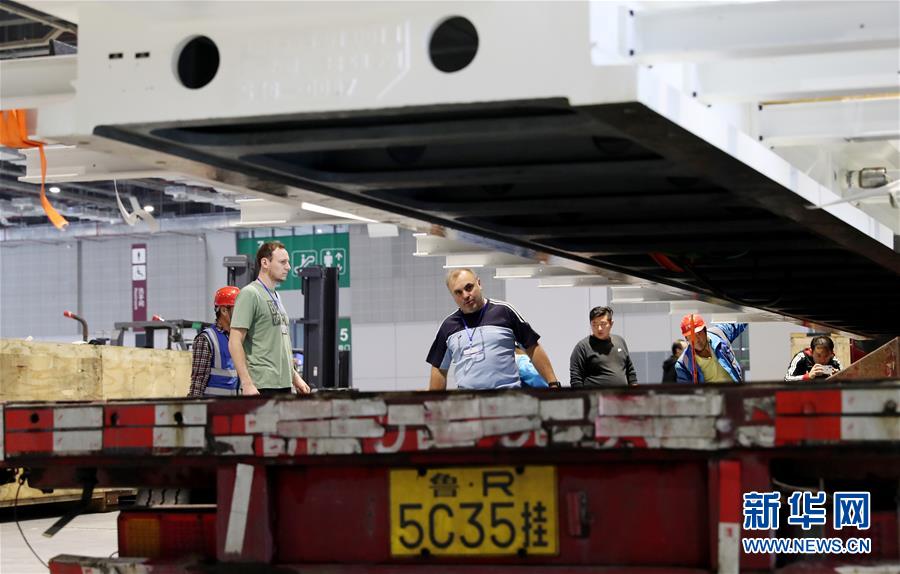 10月22日,“金牛座”龍門銑床床身(前)等待裝運(yùn)。 當(dāng)日,來自德國的首屆進(jìn)口博覽會(huì)最大展品——“金牛座”龍門銑床完成初步組裝,將運(yùn)往國家會(huì)展中心(上海)3號(hào)館進(jìn)行最后的安裝施工。這是德國瓦德里??票す狙邪l(fā)的機(jī)床設(shè)備,高約8米,占地面積約200平方米,將在智能及高端裝備區(qū)進(jìn)行展出。 新華社記者方喆攝
