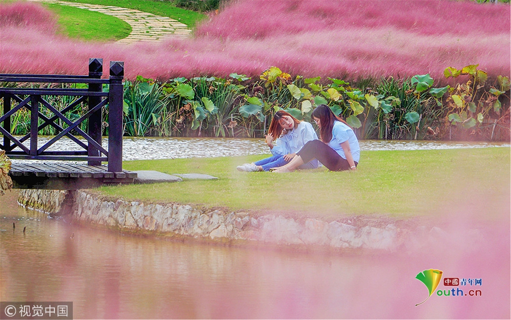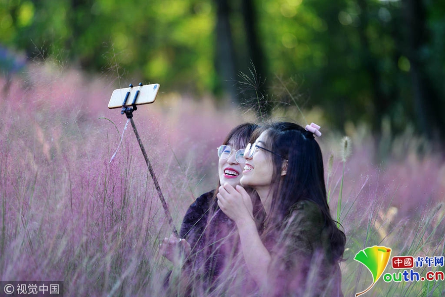 中國青年網北京10月7日電 2018年10月6日,游客在“粉色田野”里游玩、留影。粉黛亂子草是一種觀賞草種,該植物夏季為主要生長季,全株綠色,花期為9月中旬至11月中旬,開花時,綠葉為底,粉紫色花穗如發絲從基部長出,遠看如紅色云霧。