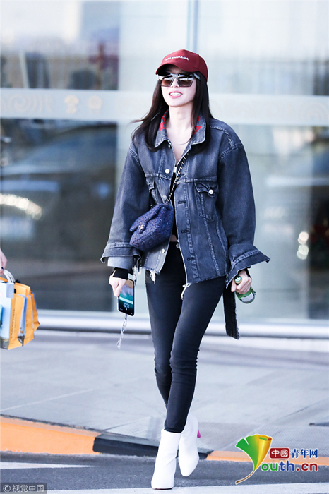 2018年10月24日,北京,“富察皇后”秦嵐現身機場。她頭戴小紅帽,身穿黑色緊身褲顯美腿筆直修長,上身穿著牛仔外套青春逼人,邊走邊甜笑玩“撩發殺”,靚麗吸睛。