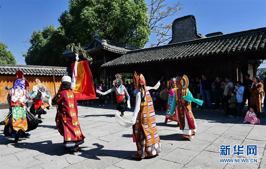 在浙江烏鎮(zhèn)西柵景區(qū)的安渡坊碼頭廣場上,西藏迥巴藏戲隊表演藏戲《頓月頓珠》(10月28日攝)。 新華社記者 張汝鋒 攝