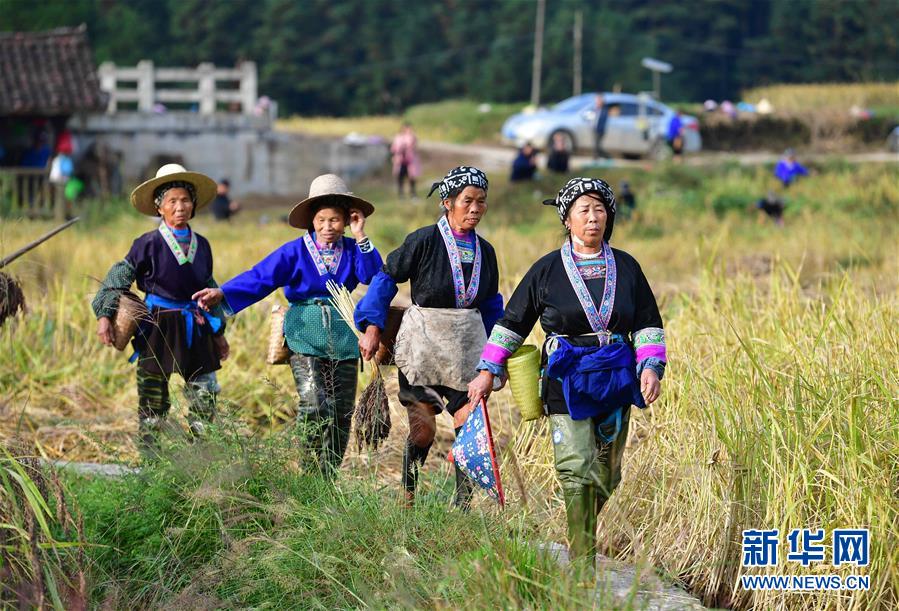 10月30日,在廣西融水苗族自治縣安太鄉元寶村,村民走在田間,準備收獲香糯。