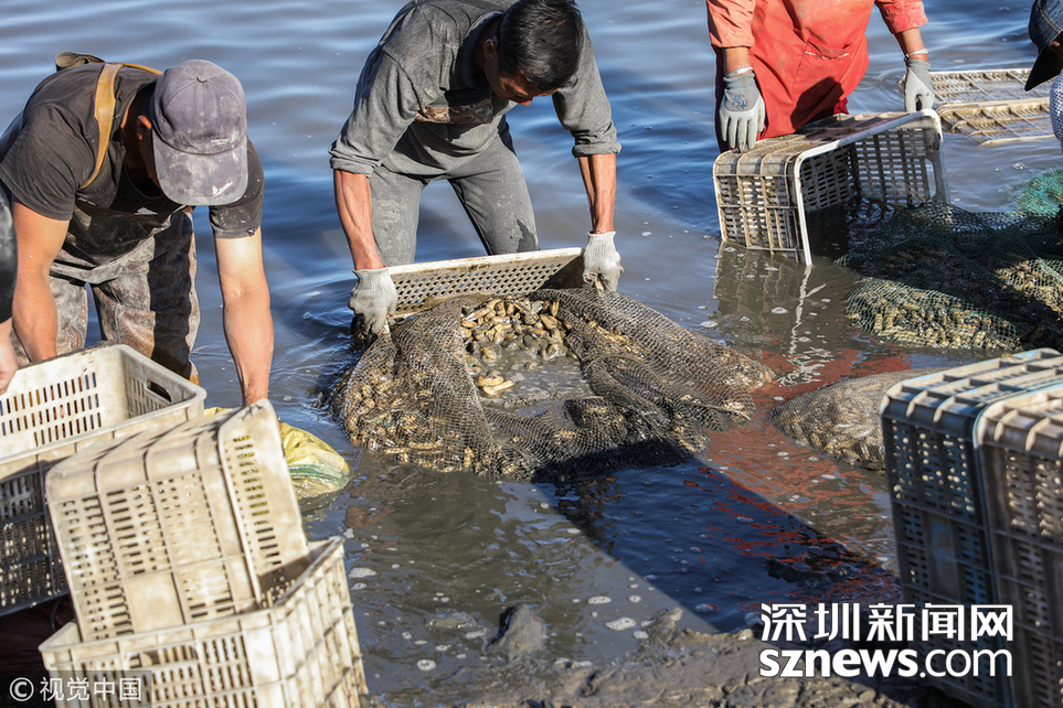 深圳新聞網(wǎng)訊 2018年9月8日,遼寧丹東,早上5點,挖蟶人紛紛下到各個池子,要在海水海泥里艱辛勞作10小時,直至下午3點集體上岸,等待買家的運輸車隊運走他們的勞動成果。9月初,遼寧沿海養(yǎng)殖區(qū)進入養(yǎng)殖海鮮的收獲季。在東港,常常出現(xiàn)數(shù)百人乃至上千人集結在池子里挖蟶子(這里特指縊蟶,即東港當?shù)厝怂f的小人仙。下同)的壯觀景象。在養(yǎng)殖海鮮的收獲季,成群的海鷗趁機“助陣“,人與大自然和諧共處的畫面令人嘆為觀止。