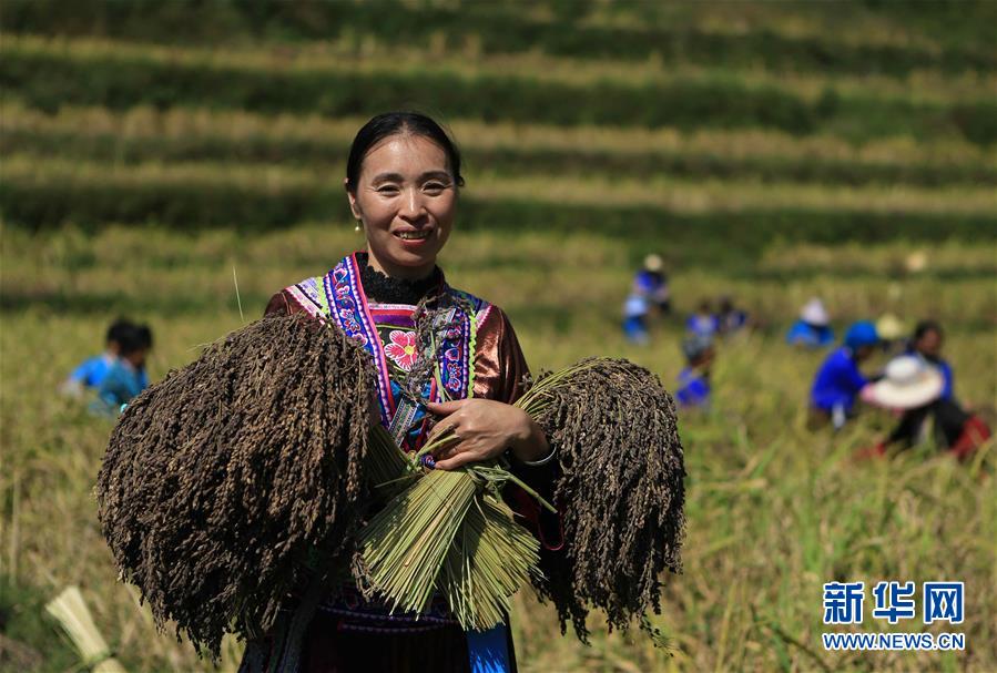10月30日,在廣西融水苗族自治縣安太鄉元寶村,合作社負責人謝秀萍在展示剛剛收獲的香糯。 新華社記者 吳建路 攝