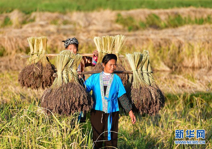10月30日,在廣西融水苗族自治縣安太鄉元寶村,村民挑著香糯走在田間。 新華社記者 黃孝邦 攝