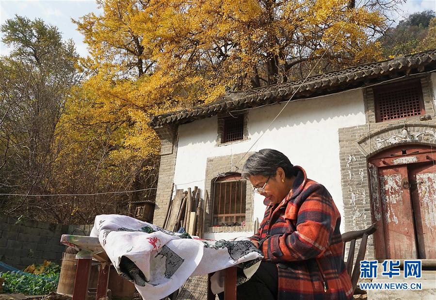 11月1日,河南省嵩縣白河鄉下寺村的一位村民在自家門前制作刺繡工藝品。 深秋時節,河南省嵩縣白河鄉下寺村的古銀杏林為小山村披上了“金甲”。漫天黃葉,遍地金色,一幢幢民居掩映在色彩斑斕的世界里,美不勝收,吸引了眾多游客賞景拍照。 新華社記者 李安 攝