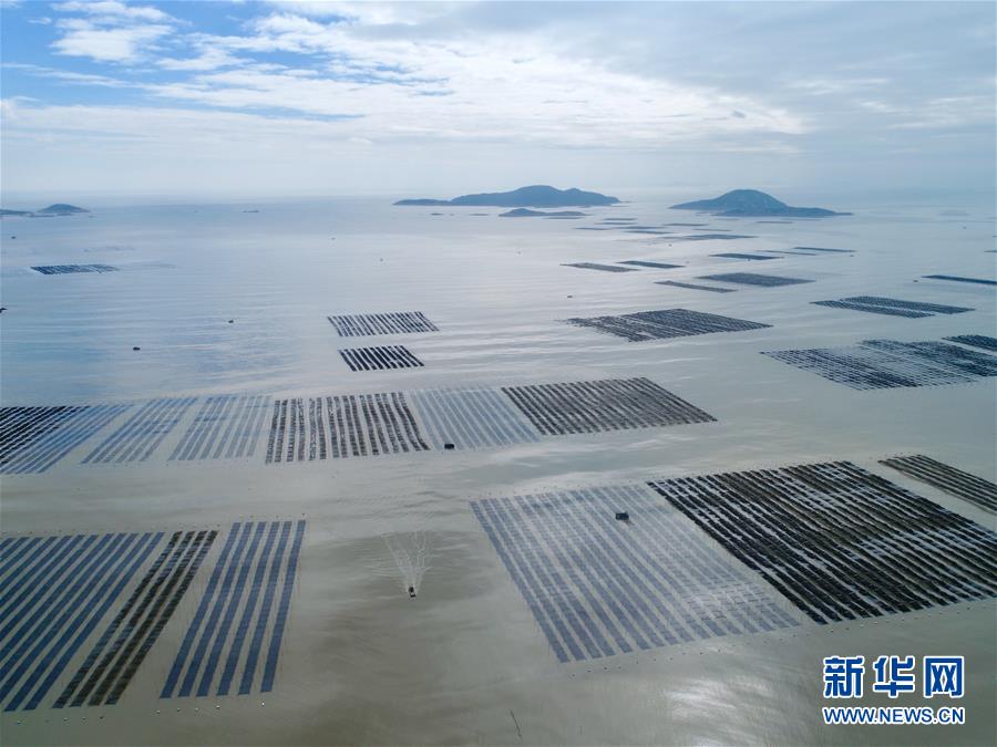 這是11月4日無人機拍攝的霞浦縣三沙鎮的紫菜種植區。 近日,福建省霞浦縣沿海6萬畝紫菜迎來收獲季節,漁民們出海收獲紫菜,海上田園一派繁忙豐收景象。 新華社記者 姜克紅 攝